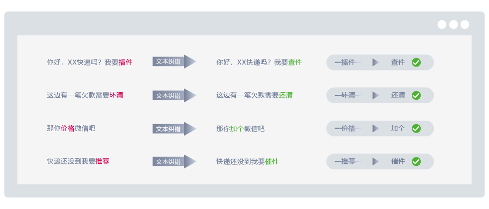 During dialogue, customers' words are often misrecognized by speech recognition. By analyzing the form and characteristics of massive dialogue content, the results of speech recognition can be automatically corrected, and then answers more in line with user needs can be provided, effectively identifying the impact of errors on users' real needs.